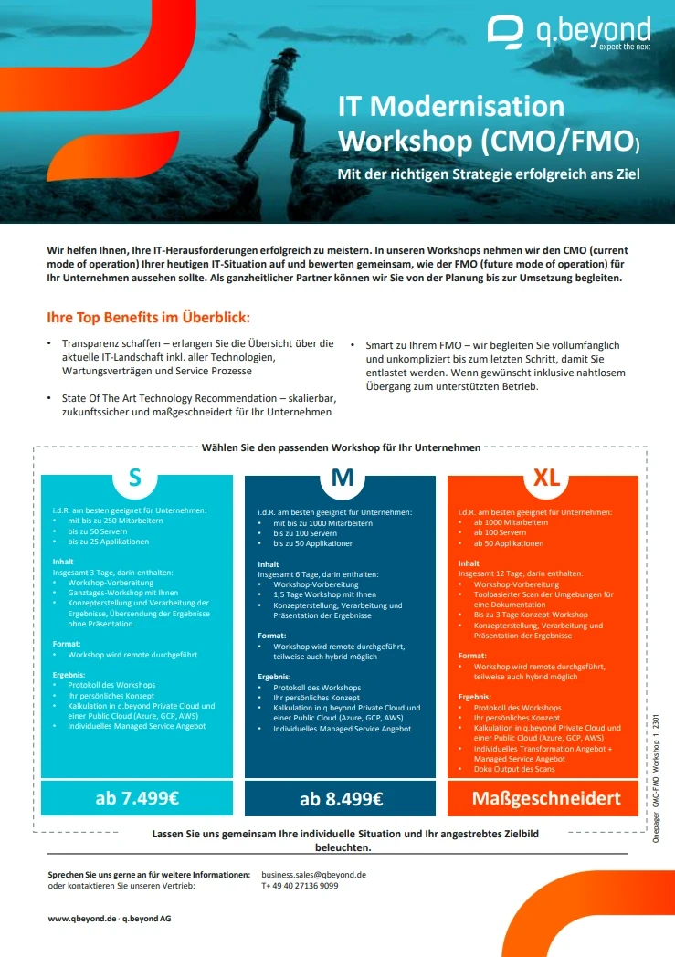 In unserem IT Modernisation Workshop (CMO/FMO) dreht sich alles um Ihre IT-Strategie, den CMO (Current Mode of Operation) und wie der FMO (Future Mode of Operation) für Ihr Unternehmen aussehen sollte. Gemeinsam mit Ihnen setzen wir uns mit IT-Trends und -Herausforderungen auseinander und entwickeln einen Business Case, um Ihre IT optimal auf die Bedürfnisse Ihres Unternehmens auszurichten. Lernen Sie von erfahrenen Experten, wie Sie Ihre IT-Infrastruktur modernisieren und an aktuelle Anforderungen anpassen können. Freuen Sie sich auf einen spannenden Workshop mit wertvollen Quick-Wins.